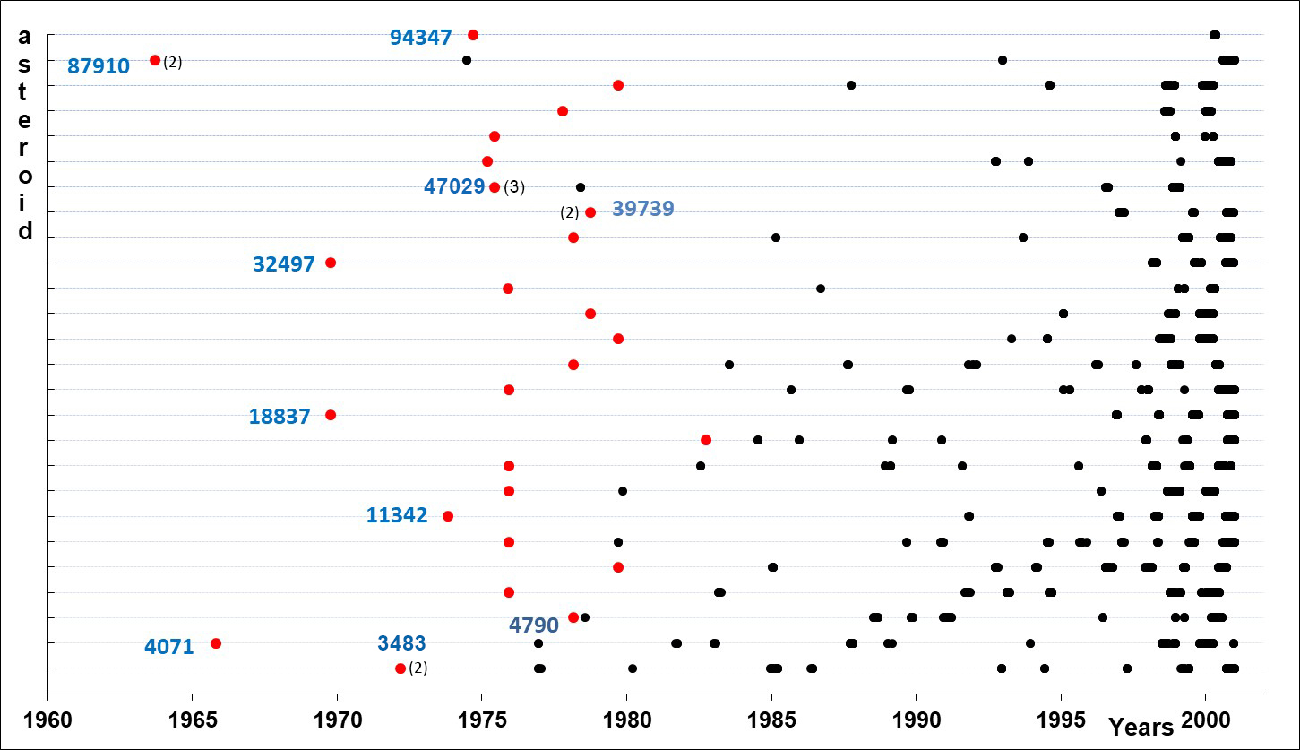 In the figure: the processed 31 asteroid positions for 26 asteroids in chronological order of observations until 2000 in comparison with the world data of these objects from MPC (red points - our processed positions, black points - MPC-positions). The number of positions obtained for individual asteroids is given in brackets if there is more than one.